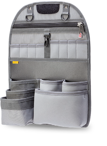 Taskan er einnig með tvær ræmur af mótuðu lóðréttu MOLLE-efni fyrir viðbótarfestingarpunkta fyrir klemmur, sterkan hitamótaðan vasa að framan, ytri geymsluvasa fyrir mælitæki og snúrur.